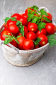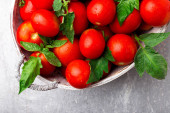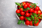 Zdjęcie "Czerwony pomidor w szary kosz na szarym tle. Widok z góry. Kopiować miejsca. Żniwa. W polu pełna pomidory." może być wykorzystywane do celów osobistych i komercyjnych zgodnie z warunkami zakupionej licencji Royalty-free. Obraz jest dostępny do pobrania w jakości wysokiej rozdzielczości do 5760x3840.