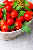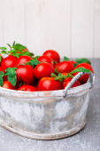 Czerwony pomidor w szary kosz na szarym tle. Widok z góry. Kopiować miejsca. Żniwa. W polu pełna pomidory.