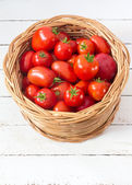 Czerwony pomidor w szary kosz na szarym tle. Żniwa. W polu pełna pomidory. Z bliska.