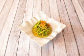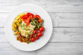 Sałatka z piersi kurczaka i grillowane warzywa, bakłażan, papryka, pomidory, awokado i Pęcherzyca na tabliczce na podłoże drewniane z bliska. Widok z góry
