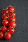 Gałąź czerwonych pomidorów cherry na białym na czarnym tle drewnianych z bliska