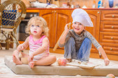 Dwoje rodzeństwa - chłopiec i dziewczynka - w czapki szefa siedzi na Kuc