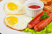 Zdjęcie "Śniadanie angielskie - tosty, jajka, Sałatka z kiełbasą i warzywami. Drewniane tle rustykalnym. Szczelnie-do góry. Widok z góry" może być wykorzystywane do celów osobistych i komercyjnych zgodnie z warunkami zakupionej licencji Royalty-free. Obraz jest dostępny do pobrania w jakości wysokiej rozdzielczości do 5760x3840.