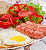Śniadanie angielskie - tosty, jajka, Sałatka z kiełbasą i warzywami. Drewniane tle rustykalnym. Szczelnie-do góry. Widok z góry