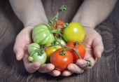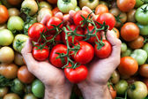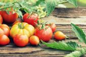 Świeżych organicznych pomidorów czerwony, żółty, pomarańczowy i zielony. Kolorowe ekologiczne pomidory w rękach rolników
