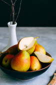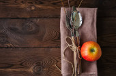 Gałęzie drzewa, jabłko, sztućce na len worze na drewniane b
