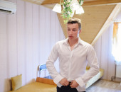 Portret przystojny pan młody, pozowanie na własną rękę w pokoju na
