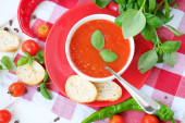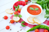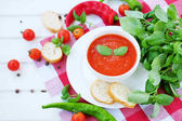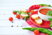 Zimne lato pomidor danie. Gaspacho zupa z toast.