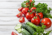 Zdjęcie "Wiśniowe pomidory na oddział, ogórek, natka pietruszki" może być wykorzystywane do celów osobistych i komercyjnych zgodnie z warunkami zakupionej licencji Royalty-free. Obraz jest dostępny do pobrania w jakości wysokiej rozdzielczości do 5760x3840.