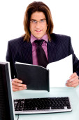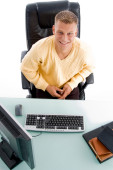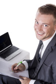 Zdjęcie "Powrót stanowią uśmiechający się człowiek pisze na podkładce" może być wykorzystywane do celów osobistych i komercyjnych zgodnie z warunkami zakupionej licencji Royalty-free. Obraz jest dostępny do pobrania w jakości wysokiej rozdzielczości do 5760x3840.