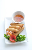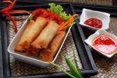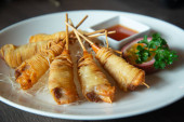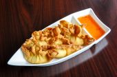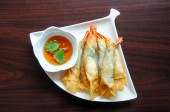Bułki, krewetki krewetki cała walcowane z liści bazylii w otoka chrupki ryż, smażone & serwowane z naszych pikantny domowe słodkie & kwaśny sos