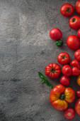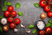 Świeże pomidory na czarnym tle łupek.