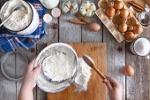 Dokonywanie ciasta widok z góry na rustykalne drewniane tła