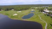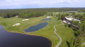 Pole golfowe w słoneczny dzień, Fantastyczny klub golfowy ze stawami i trawa zielona, widok z nieba
