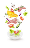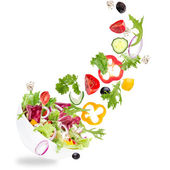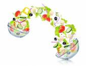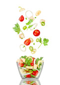 Zdjęcie "Białe płytki z sałatką w locie: pomidor, pieczarki, ser, oli" może być wykorzystywane do celów osobistych i komercyjnych zgodnie z warunkami zakupionej licencji Royalty-free. Obraz jest dostępny do pobrania w jakości wysokiej rozdzielczości do 5760x3840.