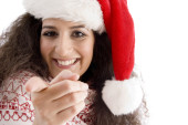 kobieta z Boże Narodzenie kapelusz i otwarte dłonie