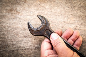 Zardzewiały, stary warsztat klucze. Hydrauliczne klucze na stół czarny w w