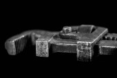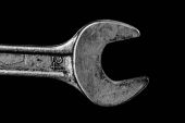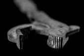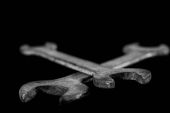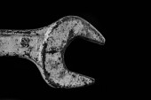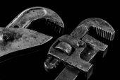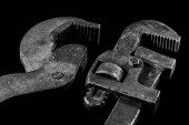 Zardzewiały, stary warsztat klucze. Hydrauliczne klucze na stół czarny w w