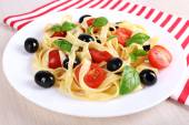 spaghetti z świeżych pomidorów, oliwek i mięty