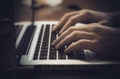 Biznesmen korzystający z laptopa. mężczyzna ręka wpisując na laptop klawiatury