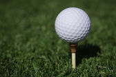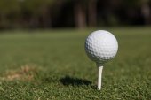 Profesjonalny golfista wkładający piłkę do dołka. Piłka golfowa przy krawędzi otworu z graczem w tle w słoneczny dzień