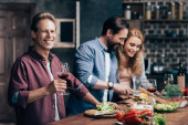 Zdjęcie "znajomych do picia wina podczas gotowania kolacji" może być wykorzystywane do celów osobistych i komercyjnych zgodnie z warunkami zakupionej licencji Royalty-free. Obraz jest dostępny do pobrania w jakości wysokiej rozdzielczości do 5760x3840.