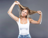 Piękna młoda kobieta ciągnięcie włosy na szarym tle.