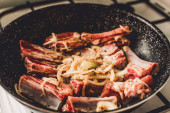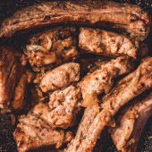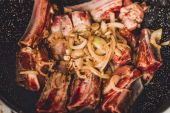 Pieczone żeberka z cebuli na patelni, widok z góry