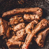 Pieczone żeberka z cebuli na patelni, widok z góry