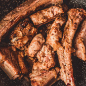 Pieczone żeberka z cebuli na patelni, widok z góry