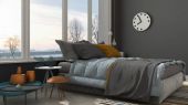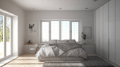 Kolorowe Nowoczesna sypialnia biały z duże panoramiczne okna, zachód słońca,