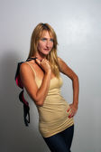moda młoda kobieta z czerwony worek na białym tle