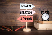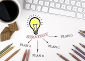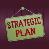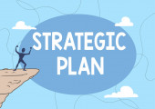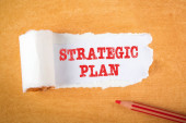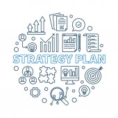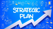 Koncepcja planu strategicznego. Strzałka z słowa kluczowe i ikony na szarym tle