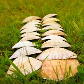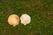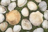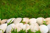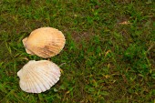 Duże białe muszle na tle zielonej trawy.