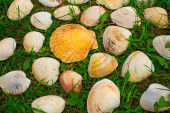 Zdjęcie "Duże białe muszle na tle zielonej trawy." może być wykorzystywane do celów osobistych i komercyjnych zgodnie z warunkami zakupionej licencji Royalty-free. Obraz jest dostępny do pobrania w jakości wysokiej rozdzielczości do 5760x3840.