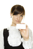piękna dziewczyna w białej sukni wyświetlone wizytówkę. na białym tle.