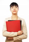 Portret uśmiechnięta kobieta biznesu z papieru foldery, na białym tle