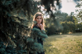 Piękna dziewczyna w czarnej kurtce w pobliżu konstrukcje szklane