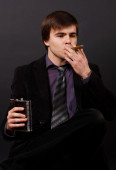 młody biznesmen, siedząc na kanapie z alkohol i cygara