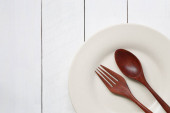 Płyta i drewnianą łyżką umieszczone na białym tle z drewna