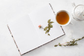 Ziołowe herbaty w dłoni na łóżku z książki i muzyka