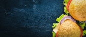 Hamburger z sera, mięsa, pomidorów i cebuli i ziół. Na podłoże drewniane. Widok z góry. Wolna przestrzeń.