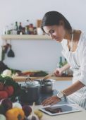 Młoda kobieta używa tabletu do gotowania w kuchni