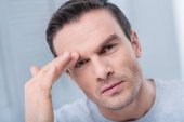 Portret przystojny, ponure człowieka, patrząc na Ciebie