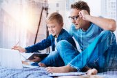 Zdjęcie "Wstępnie teen chłopiec pokazano jego prezentacji do ojca" może być wykorzystywane do celów osobistych i komercyjnych zgodnie z warunkami zakupionej licencji Royalty-free. Obraz jest dostępny do pobrania w jakości wysokiej rozdzielczości do 5760x3840.