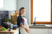 Zdjęcie "Młoda kobieta stojąca przy piecu w kuchni ." może być wykorzystywane do celów osobistych i komercyjnych zgodnie z warunkami zakupionej licencji Royalty-free. Obraz jest dostępny do pobrania w jakości wysokiej rozdzielczości do 5760x3840.