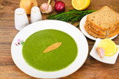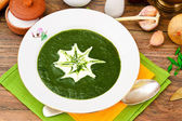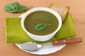 Zielony krem szpinak zupa na biały drewniany stół