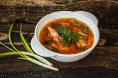 Warzywo barszcz. Tradycyjna zupa ukraińskich i rosyjskich. Podłoże drewniane. Szczelnie-do góry. Widok z góry