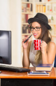 Zamknij upf młody piękny businesswoman uśmiechający się pracy i picia kawy. Koncepcja biznesowa