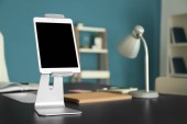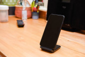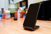 inteligentny telefon i tablet ładowania bezprzewodowego na biały biurko